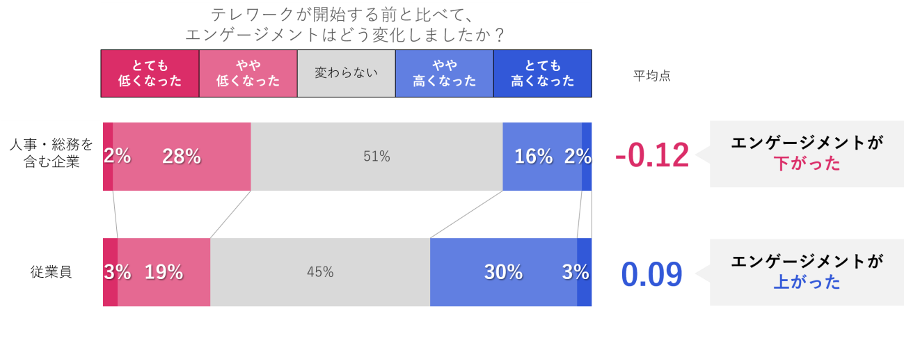 次に、テレワーク開始前と比べてエンゲージメントがどう変化したかを質問。従業員側は「エンゲージメントが高くなった」派が「低くなった」派より多いのに対し、企業側は「エンゲージメントが低くなった」派の方が多い結果に。生産性と同様に、従業員と企業に認識ギャップがあった。