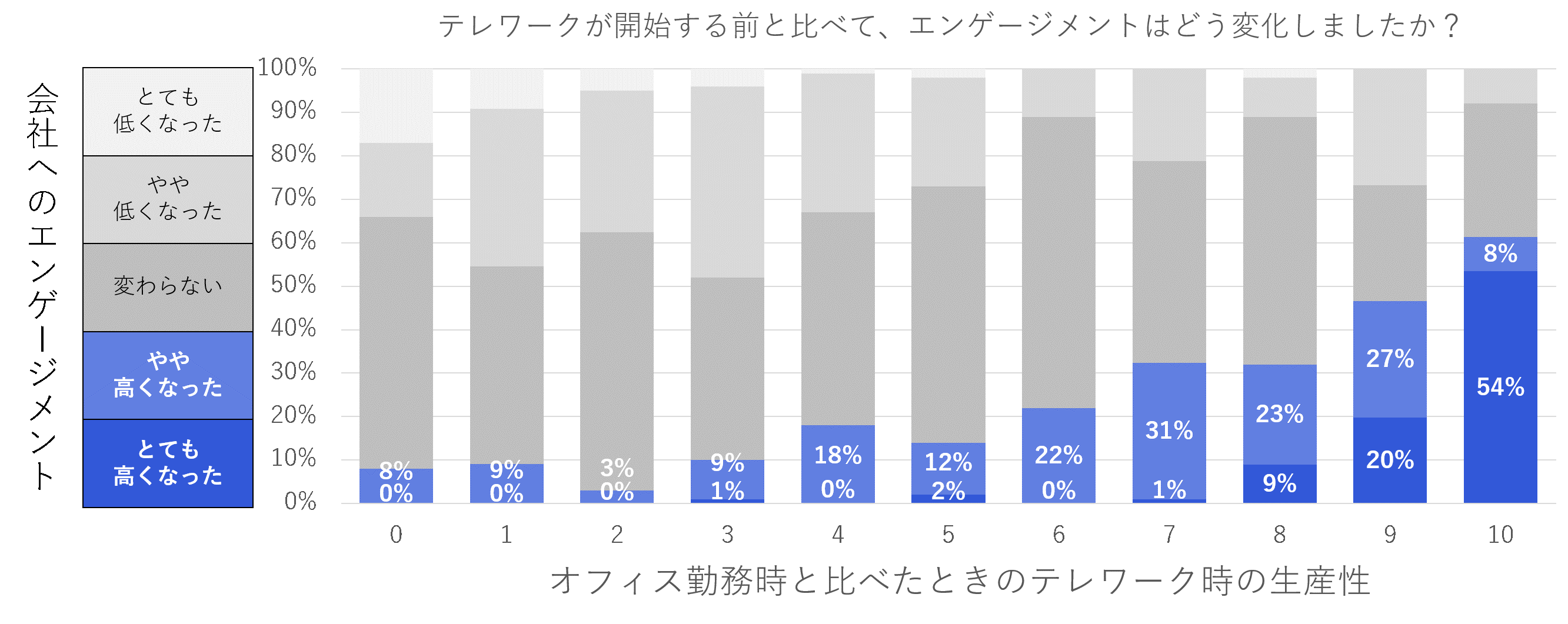 下の図は、従業員の「オフィス勤務時と比較したテレワーク時の生産性」と「テレワーク開始以降のエンゲージメント変化」の関係性を検証したものだ。オフィス勤務時より生産性が高まったと感じている人は「会社に対するエンゲージメントが高まった」と回答した割合が高い。