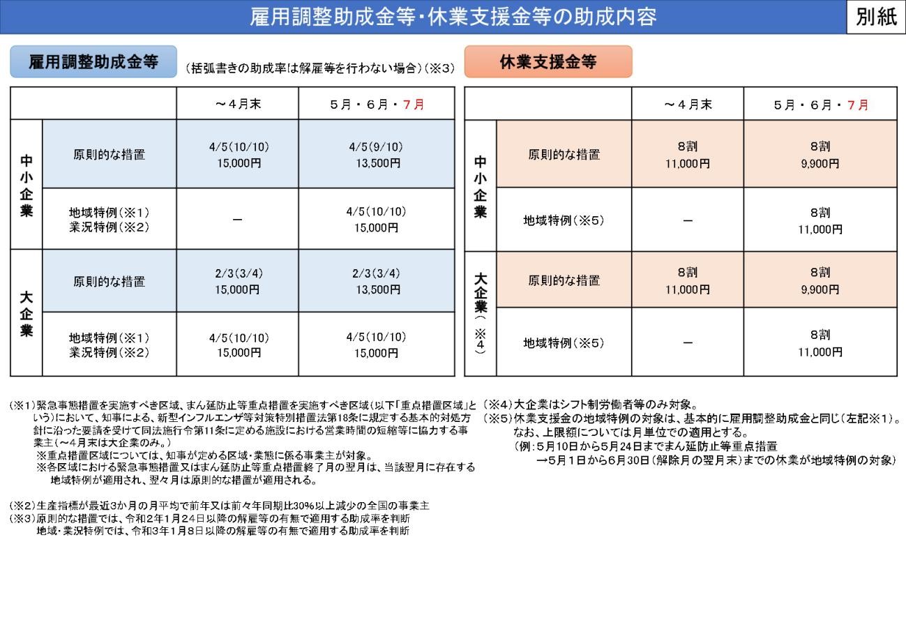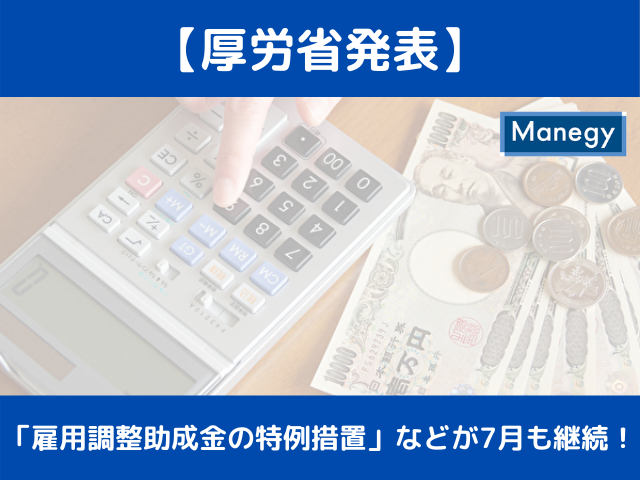 昨年11月下旬の時点では「休業者数・失業者数が急増するなど雇用情勢が大きく悪化しない限り、雇用調整助成金の特例措置等は、段階的に縮減を行っていく」と表明し、今年5月以降は助成金が減額となりました。7月は、長引く新型コロナウイルスの感染拡大の影響を受けて5~6月と同じ助成が実施されることになります。