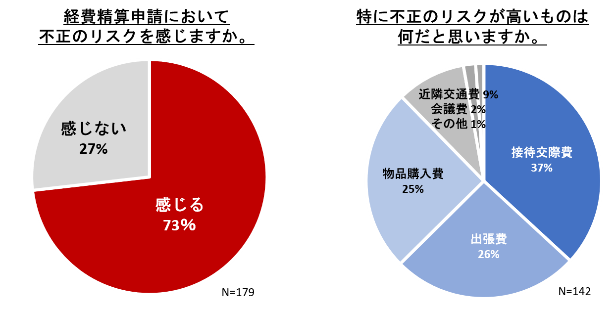 アンケートでは経費精算申請への支払承認を行っている経理・財務担当者にまず、経費精算申請において不正のリスク(軽微なものも含む)を感じるか聞いた。結果は「感じる」と答えた人が73%と、大半が不正リスクを感じていることがわかった。