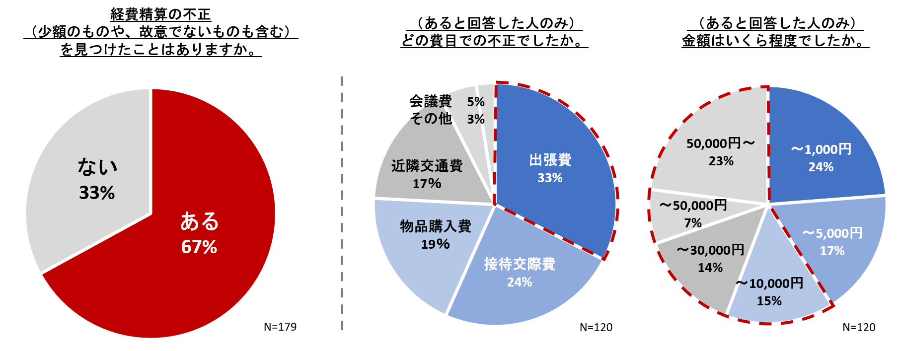また、67%の人が「経費精算の不正を見つけたことがある」と回答。その人たちを対象に、不正の費目と金額を聞いた。多かった費目は「出張費」(33%)と「接待交際費」(24%)。金額は、最多が「1,000円未満」(24%)だが、10,000~50,000円以上の高額不正は合計で59%と半数以上を占めた。前述のとおり、「出張費」や「接待交際費」など金額が大きい費目の不正が多いため、不正額も高くなったと考えられる。