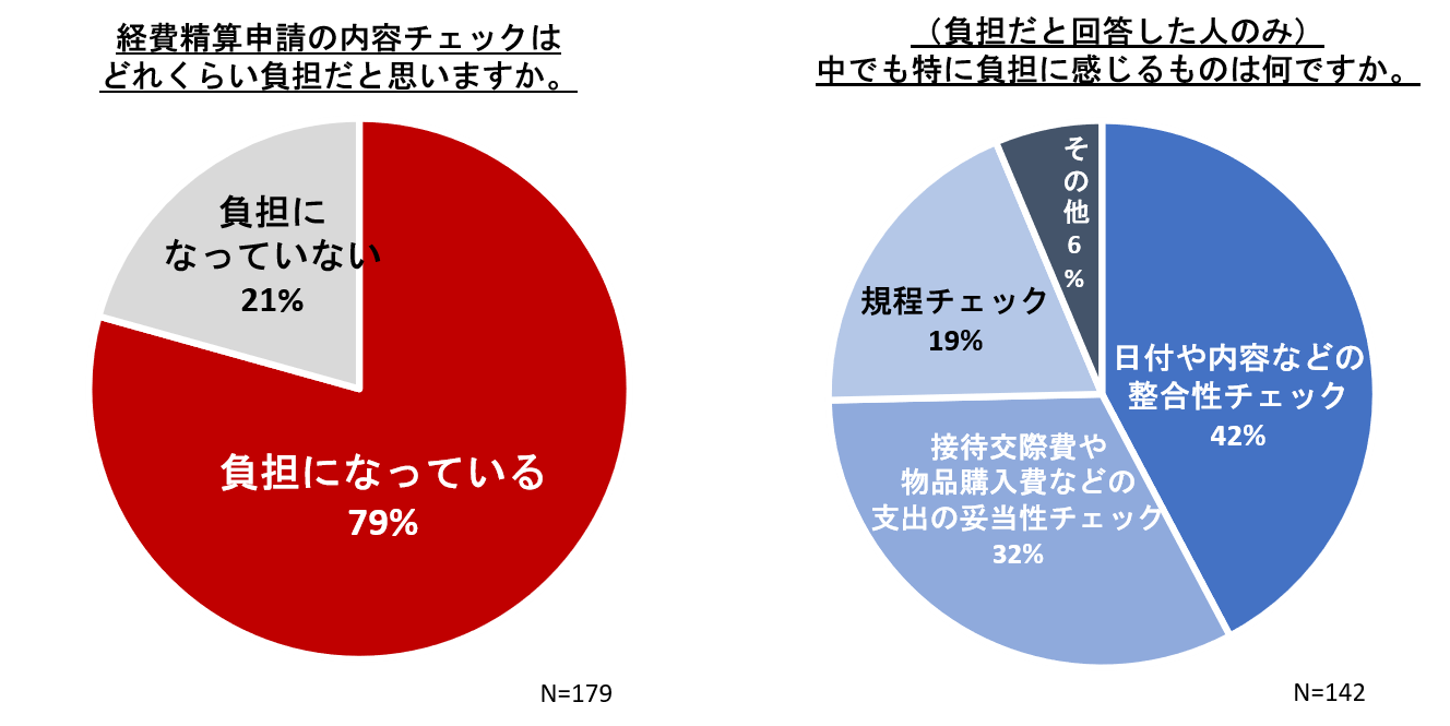 アンケートでは経費精算申請の内容チェックの負担についても尋ねている。「負担になっている」と回答した人は79%にものぼり、経理・財務担当者たちの苦労が結果に表れた。