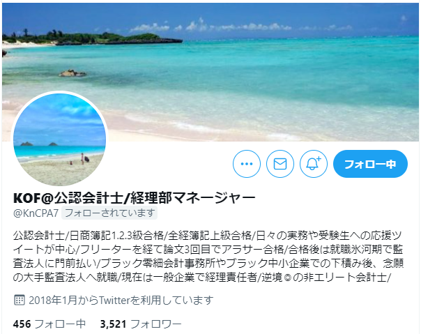公認会計士/日商簿記1.2.3級合格/全経簿記上級合格/日々の実務や受験生への応援ツイートが中心/フリーターを経て論文3回目でアラサー合格/合格後は就職氷河期で監査法人に門前払い/ブラック零細会計事務所やブラック中小企業での下積み後、念願の大手監査法人へ就職/現在は一般企業で経理責任者/逆境◎の非エリート会計士/