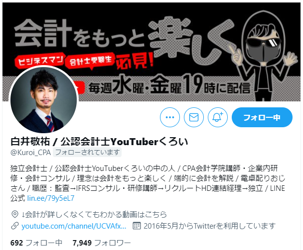 独立会計士 / 公認会計士YouTuberくろいの中の人 / CPA会計学院講師・企業内研修・会計コンサル / 理念は会計をもっと楽しく / 端的に会計を解説 / 電卓配りおじさん / 職歴:監査→IFRSコンサル・研修講師→リクルートHD連結経理→独立 / LINE公式 https://lin.ee/79y5eL7