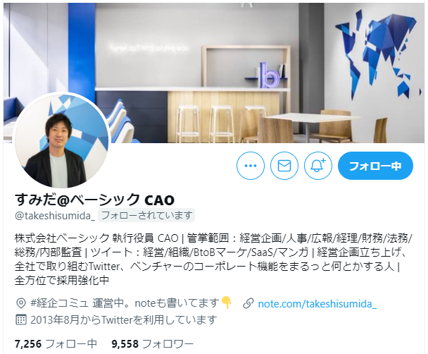 株式会社ベーシック 執行役員 CAO | 管掌範囲:経営企画/人事/広報/経理/財務/法務/総務/内部監査 | ツイート:経営/組織/BtoBマーケ/SaaS/マンガ | 経営企画立ち上げ、全社で取り組むTwitter、ベンチャーのコーポレート機能をまるっと何とかする人 | 全方位で採用強化中