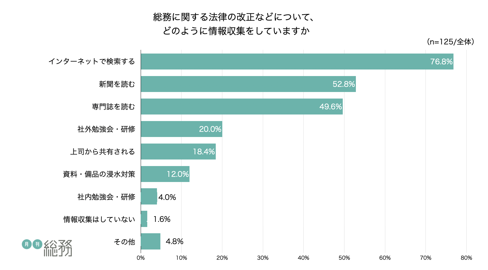 そこで、総務に関する法律の改正などについて、どのように情報収集をしているかも尋ねてみた。結果は「インターネットで検索する」が76.8%で最も多く、「新聞を読む」が52.8%、「専門誌を読む」が49.6%だった。また、「社外勉強会・研修」は20.0%だが、「社内勉強会・研修」は4.0%のみだった(n=125/全体)。