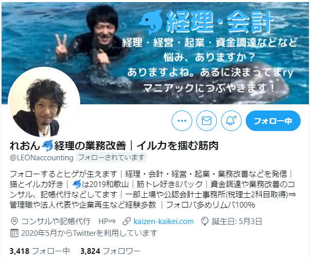 フォローするとヒゲが生えます|経理・会計・経営・起業・業務改善などを発信|猫とイルカ好き|2019和歌山|筋トレ好き8パック|資金調達や業務改善のコンサル、記帳代行などしてます|一部上場や公認会計士事務所(税理士2科目取得)⇒管理職や法人代表や企業再生など経験多数 |フォロバ多めリムバ100%