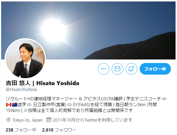 リクルートHD連結経理マネージャー&アビタスUSCPA講師 | 学生テニスコーチ⇒カナダ&オーストラリア遊学 ⇒日立製作所(営業)⇒EY(FAAS)を経て現職 | 毎日朝ラン5km (月間150km) | ※投稿は全て個人的見解であり所属組織とは無関係です