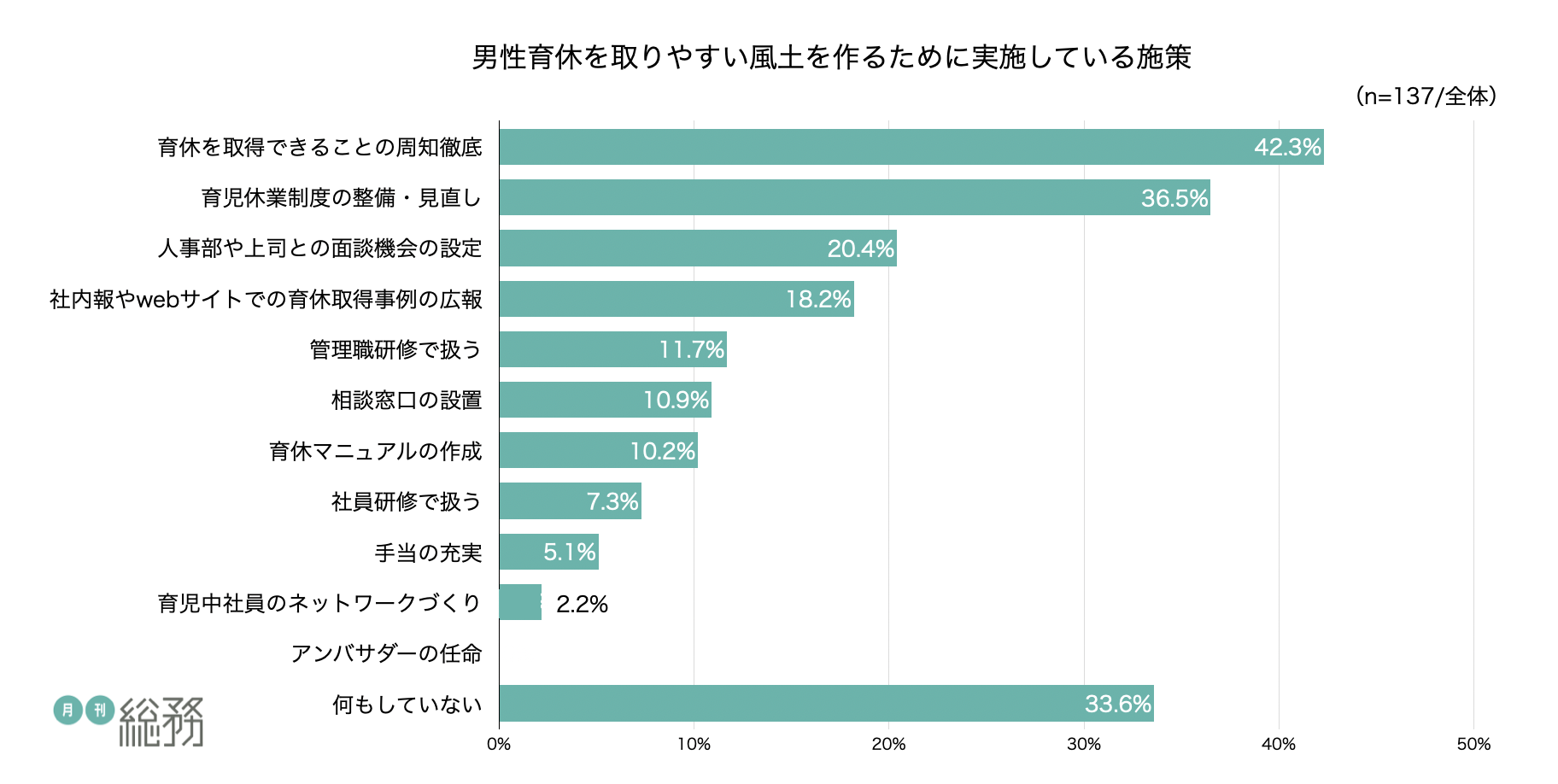 次に、男性が育休を取りやすい風土を作るために自社が実施している施策について尋ねた。最多回答は「育休を取得できることの周知徹底」42.3%、2番目は「育児休業制度の整備・見直し」36.5%という結果に。一方で「何もしていない」は33.6%だった(n=137/全体)。