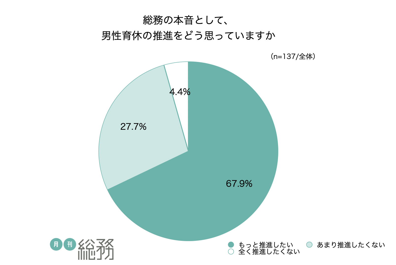 また本調査では、総務担当者として“本音では”男性育休の推進をどう思っているかも尋ねている。結果は「もっと推進したい」が67.9%、「あまり推進したくない」が27.7%、「全く推進したくない」が4.4%だった(n=137/全体)。