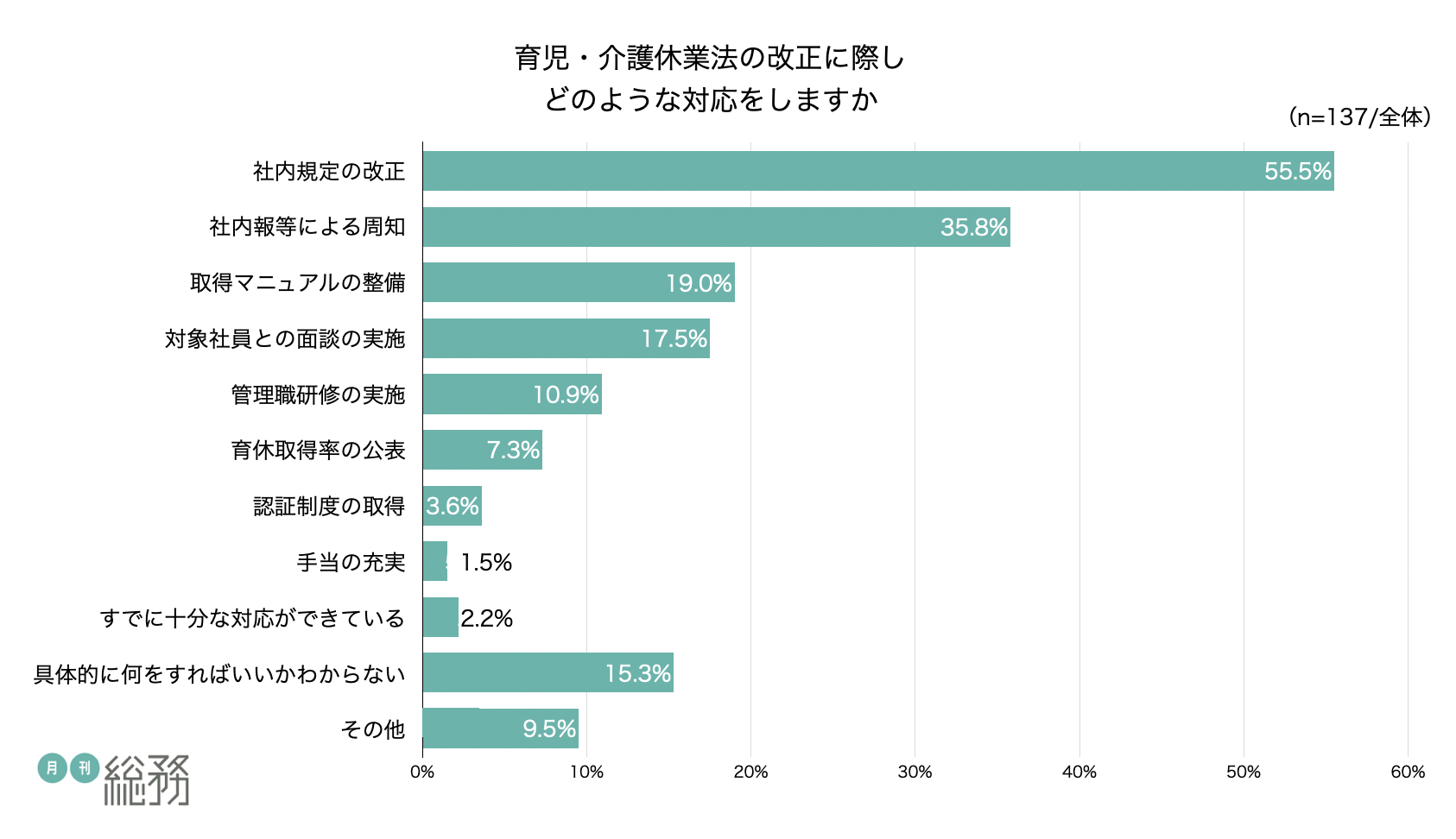 また、法改正でどのような対応をするのか尋ねた質問では、「社内規定の改正」が55.5%で最も多く、次に「社内報等による周知」が35.8%、「取得マニュアルの整備」が19.0%だった(n=137/全体)。