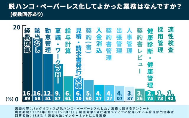 まず、アンケート1問目の質問は「脱ハンコ・ペーパーレス化してよかった業務は何ですか?(複数回答あり)」。