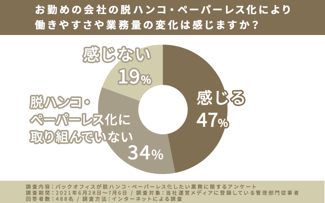 結果は「感じる」が47%、「感じない」は19%に。また「脱ハンコ・ペーパーレス化に取り組んでいない」と答えた人は34%いて、3問目の質問で「進んでいない」と回答した人とほぼ同率でした。