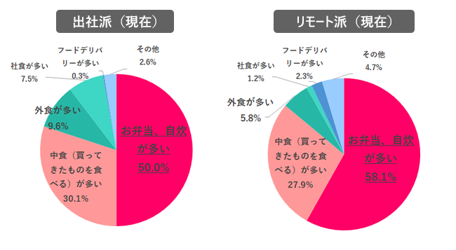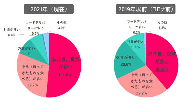 また、2021年(現在)の働く環境(出社派またはリモート派)別に、ランチ状況を質問。結果、トップ3の順位は同じだったが、「お弁当、自炊が多い」はリモート派の方が8.1%多く、「外食が多い」は出社派の方が3.8%多かった。外出機会の頻度の違いで、ランチスタイルもある程度変わるようだ。