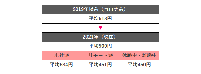 また、2021年(現在)の働く環境別のランチ代は、出社派534円、リモート派451円、休職中・離職中450円だった。出社派は外食や中食、社食の利用率が高いため、出費が増えて平均金額も高めなのだろう。