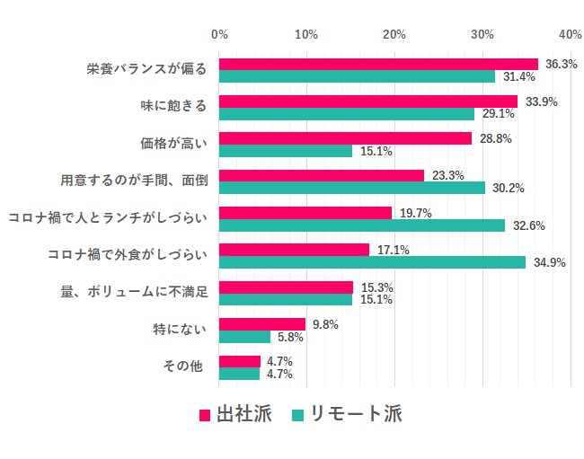 栄養バランスに関しては働く環境が異なっても共通する悩み・不安だが、コロナ禍の自粛で外食や人とのランチができないという悩みは、リモート派ならではと言える。