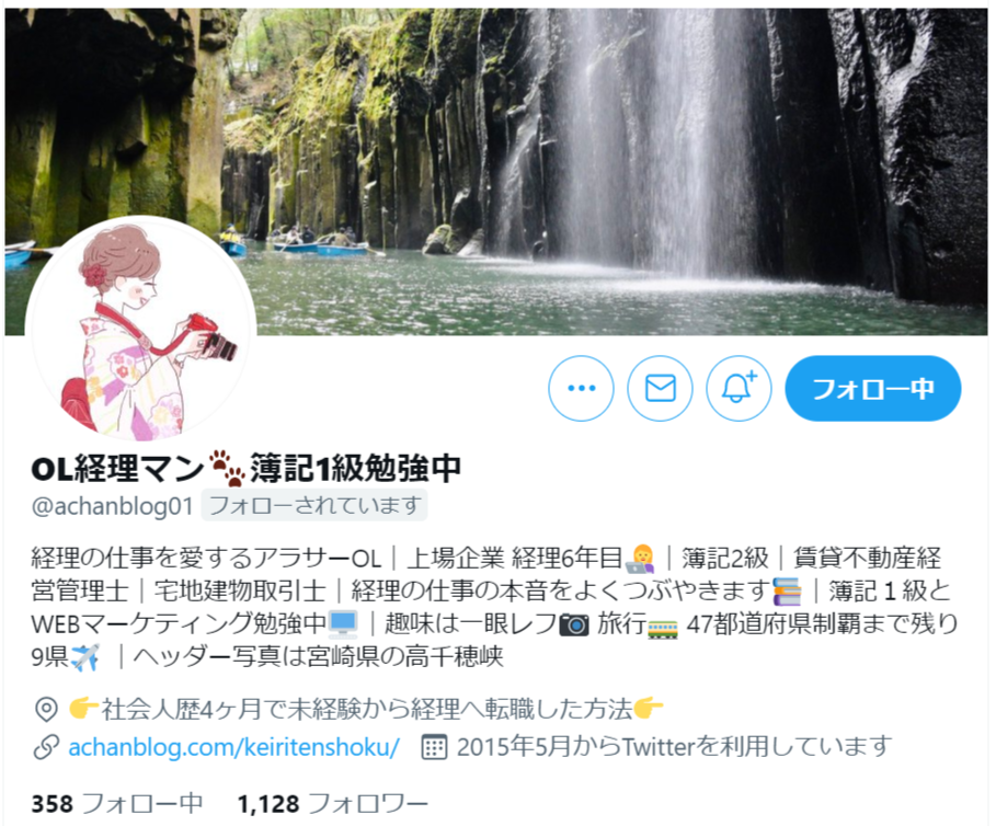 経理の仕事を愛するアラサーOL|上場企業 経理6年目|簿記2級|賃貸不動産経営管理士|宅地建物取引士|経理の仕事の本音をよくつぶやきます|簿記1級とWEBマーケティング勉強中|趣味は一眼レフ 旅行 47都道府県制覇まで残り9県|ヘッダー写真は宮崎県の高千穂峡