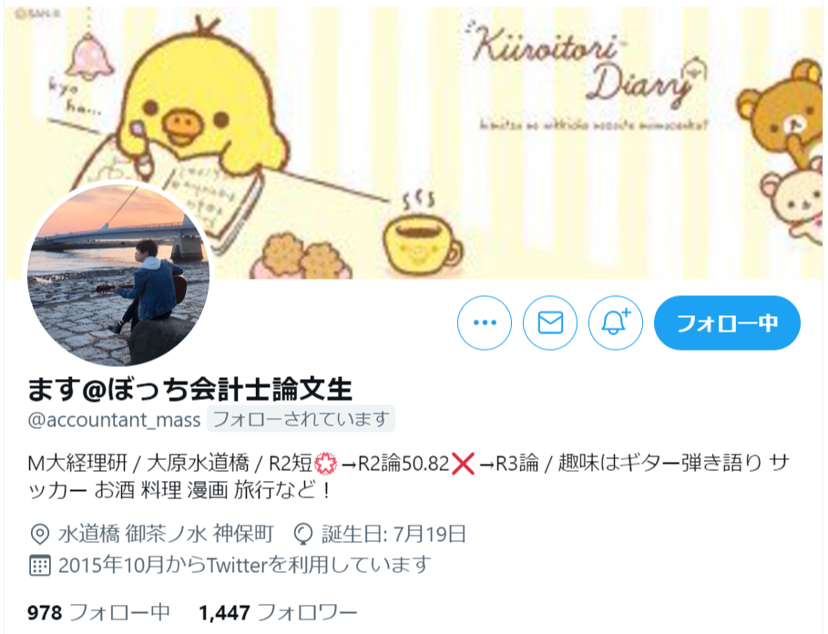 M大経理研 / 大原水道橋 / R2短?→R2論50.82✖→R3論 / 趣味はギター弾き語り サッカー お酒 料理 漫画 旅行など!