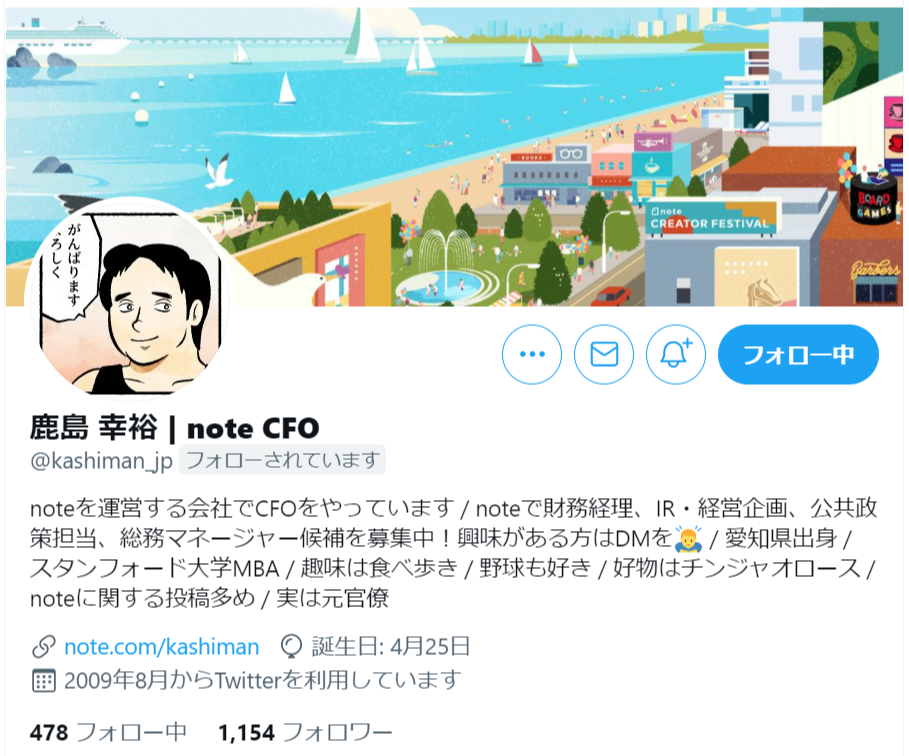 noteを運営する会社でCFOをやっています / noteで財務経理、IR・経営企画、公共政策担当、総務マネージャー候補を募集中!興味がある方はDMを!/ 愛知県出身 / スタンフォード大学MBA / 趣味は食べ歩き / 野球も好き / 好物はチンジャオロース / noteに関する投稿多め / 実は元官僚