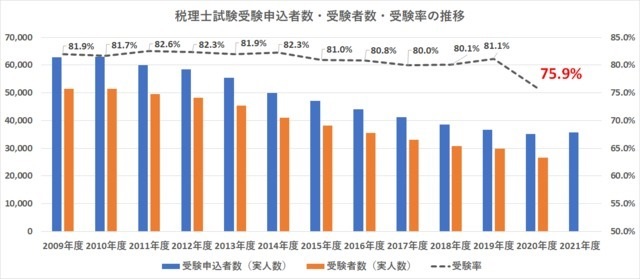 しかし、新型コロナウイルス感染症の流行したいわゆるコロナ禍での実施となった、昨年(令和2年度)の税理士試験では過去平均で約80%程度だった実際の受験者率(※)が、75.9%に低下していたことを考慮すると、実際の受験者数の動向が気になります。