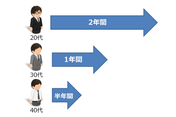 ⇒20代であれば2年間、30代であれば1年間、40代であれば最長で半年間というイメージ