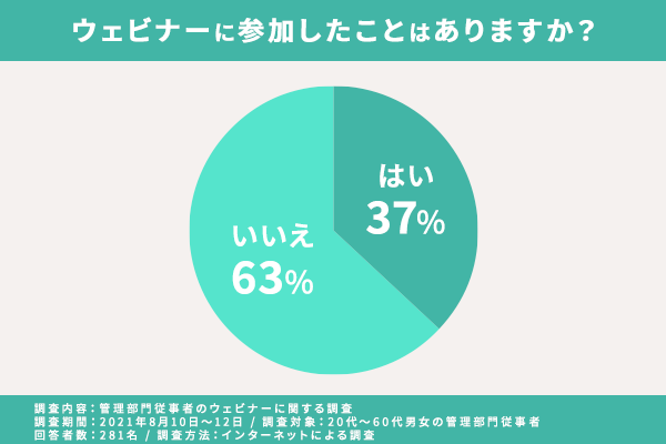 まず1問目の質問は「ウェビナーに参加したことはありますか?」(n=281)。結果は、「はい」が37%で「いいえ」が63%となりました。