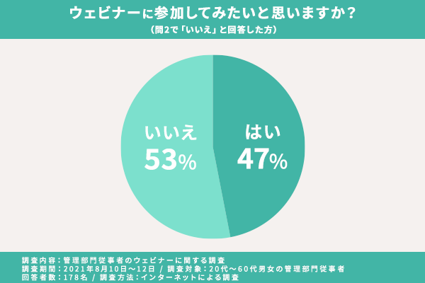 結果は、「はい」が47%で「いいえ」が53%となり、半数近くの方がウェビナーへの参加を前向きに考えているようです。