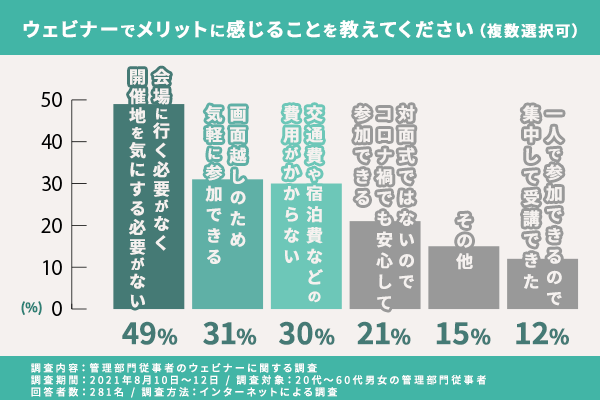 “会場に行く必要がない”“画面越しのため気軽に参加できる”“対面式ではないので安心して参加できる”などは、参加者側から見ると大きなメリットになっている様子です。また、コロナ禍だからというのもこういったことがメリットと感じやすい結果になっているようです。行動が制限されている現状でも、「学びの機会を得たい」と考えている管理部門の方は多いようです。