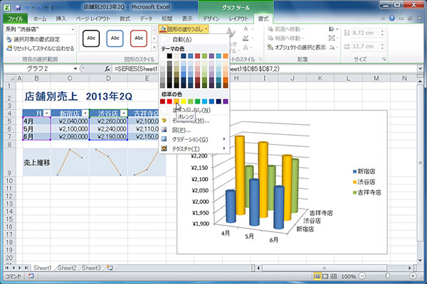 目的のオブジェクトを選択した状態で、設定したいスタイルなどのアイコンにマウスポインターを重ねるだけで、適用結果がリアルタイムでプレビューされる。例えば、グラフの系列を選択し、[図形の塗りつぶし]の色にマウスポインターを重ねると、その色が適用された系列が表示される(図1)。マウスポインターを別の色に移動すれば、その色がプレビューされ、クリックされるまで適用されない。