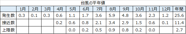 気象庁の1981年から2010年の30年間の、台風の発生数・接近数・上陸数のデータによると、年間の発生数は25.6回、接近数が11.4回、上陸数が2.4回となっています。