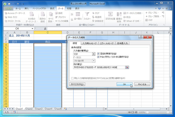そのため、データ入力の手間や時間、入力ミスのリスクを最小化できる。リスト入力の選択肢の設定方法は、設定画面にて選択肢を直接指定する方法と、あらかじめセル上に選択肢を用意しておき、設定画面でそのセル範囲を指定する方法の2通りがある。