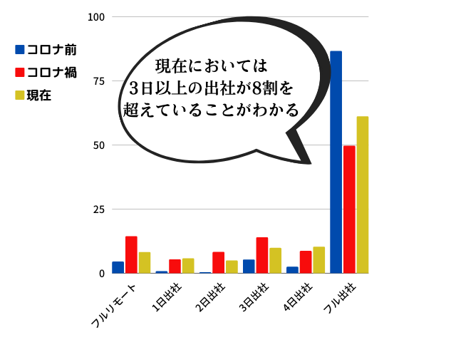 コロナ禍にフル出社していた人々は約半数、3日以上出社した人々も合わせると7割以上という高い出社率が出ました。
