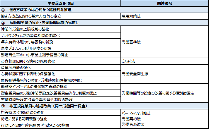 この法律は、日本の労働法制度における課題とされていた「正規社員・非正規社員の処遇の差」、「長時間労働」、「単線型のキャリアパス」について抜本的な改革を行うことを目的として、①労働基準法、②じん肺法、③雇用対策法、④労働安全衛生法、⑤労働者派遣事業の適正な運営の確保及び派遣労働者の保護等に関する法律(以下「労働者派遣法」という。)、⑥労働時間等の設定の改善に関する特別措置法、⑦短時間労働者の雇用管理の改善等に関する法律(以下「パートタイム労働法」という。)、⑧労働契約法という主要な労働関連法令を網羅的に改正するものであり、「戦後の労働基準法制定以来、70年ぶりの大改革」といわれている。