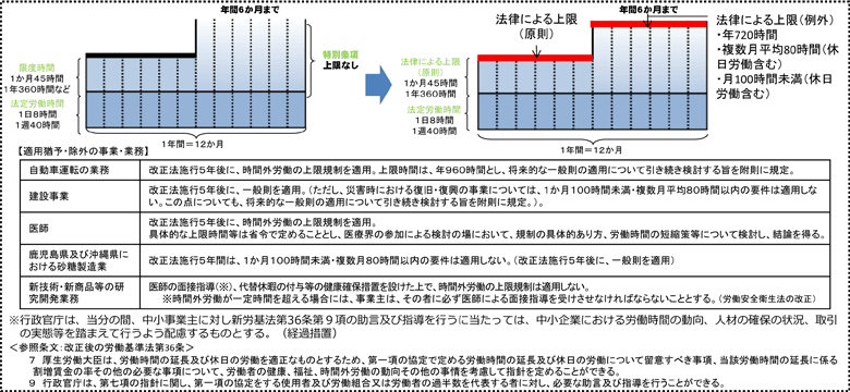 働き方改革関連法は、当該基準の内容を労働基準法に明記することにより法的強制力をもたせると共に、当該基準を満たす労使協定が締結された場合であっても原則として超過することができない残業時間の上限を新たに定めた。