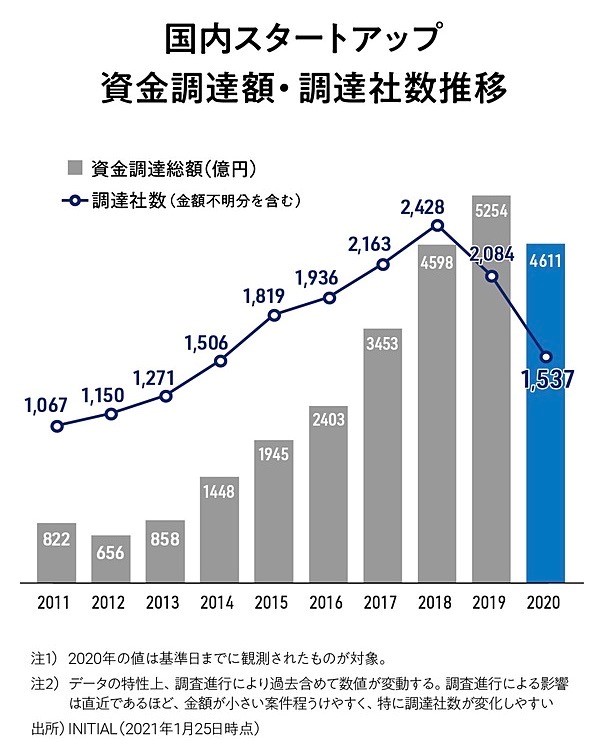 その一方で2018年までは国内スタートアップ企業の調達社数も毎年増加傾向で推移していましたが、2019年以降は調達社数が減少に入ると同時に、2020年において資金調達総額は2012年以降初めて減少局面に入りました。