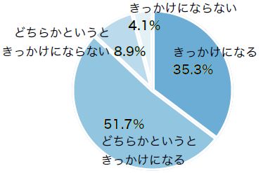 「知っている」派の269名に、自身が働く会社で「電子帳簿保存法改正」に対応したシステムを導入しているか質問したところ、31.2%が導入済み、43.5%が導入予定と回答した。さらに、同法改正は電子データの導入を検討するきっかけになると思うか質問したところ、計87.0%が「きっかけになる」(きっかけになる:35.3%+どちらかというときっかけになる:51.7%)、計13.0%が「きっかけにならない:4.1%+どちらかというときっかけにならない:8.9%」と答えた。