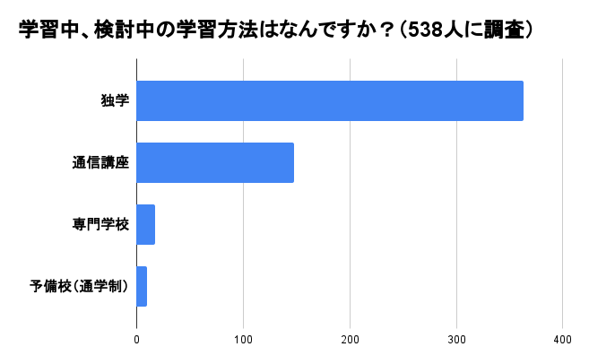 独学と通信講座で計95%と、大半を占めている。これは、学習費用が比較的安く、自分のペースで学びやすいということが、選ばれた理由と推測できる。