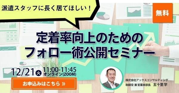 本セミナーでは、人材派遣会社様向けに派遣スタッフの「採用」、「定着」を確実にしていく手法をお伝えします。