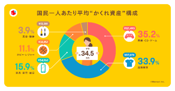 “かくれ資産”とは、1年以上使用しておらず、理由なく家庭内に保管しているモノを不要品とし、不要品保管数量調査および「メルカリ」の平均取引価格により不要品を金額に換算した数値である。