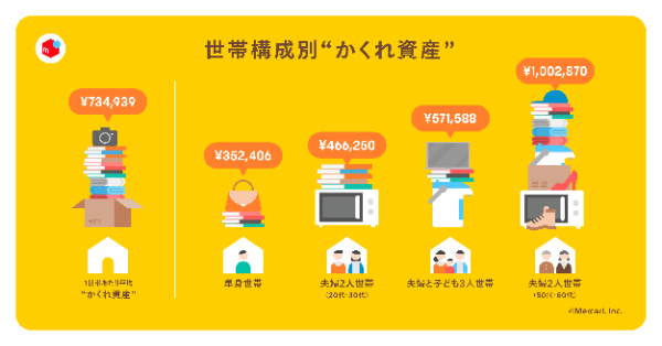 また、1世帯あたりの平均“かくれ資産”は73万4,939円となった。世帯別の平均“かくれ資産”は、単身世帯が35万2,406円、20代・30代夫婦2人世帯が46万6,250円、夫婦と子ども(15歳未満)の3人世帯が57万1,588円、50代・60代夫婦2人世帯が100万2,870円。子育て世帯や比較的高齢の世帯はモノが多い傾向があるため、平均額も高く出たのであろう。