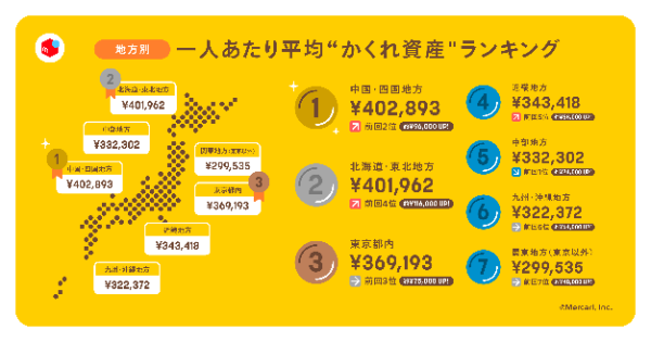 では、地方別ではどうだろうか。地方別一人あたり“かくれ資産”TOP3は、1位「中国・四国地方」(40万2,893円)、2位「北海道・東北地方」(40万1,962円)、3位「東京都内」(36万9,193円)だった。