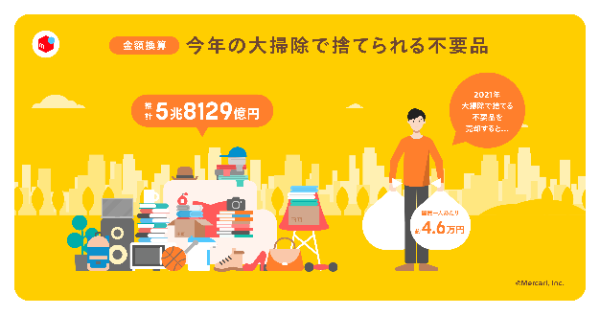 もし、年末の大掃除で出てきた不要品を売ったら、いくらぐらいになるのだろうか。現在家庭に眠っている不要品のうち、今年の大掃除で捨てる予定の不要品の数量を調査した。その数量を「メルカリ」の平均取引価格と掛けあわせて金額換算したところ、日本全国で推計約5兆8,129億円に! 国民一人あたりでは平均4万5,896円となった。