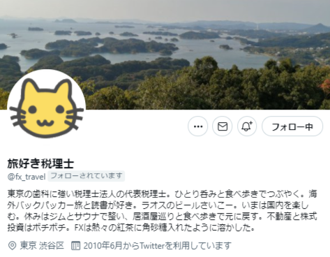 東京の歯科に強い税理士法人の代表税理士。ひとり呑みと食べ歩きでつぶやく。海外バックパッカー旅と読書が好き。ラオスのビールさいこー。いまは国内を楽しむ。休みはジムとサウナで整い、居酒屋巡りと食べ歩きで元に戻す。不動産と株式投資はボチボチ。FXは熱々の紅茶に角砂糖入れたように溶かした。
