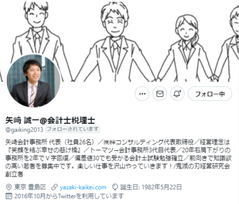 矢崎会計事務所 代表(社員26名)/㈱絆コンサルティング代表取締役/経営理念は『笑顔を結ぶ幸せの懸け橋』/トーマツ→会計事務所3代目代表/20年右肩下がりの事務所を2年でV字回復/偏差値30でも受かる会計士試験勉強確立/前向きで知識欲の高い若者を募集中です。楽しい仕事を沢山やっていきます!/鬼滅の刃経営研究会創立者