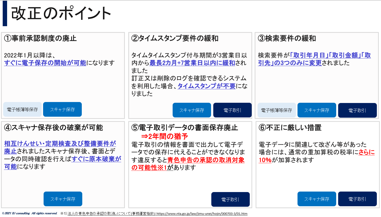改正電子帳簿保存法のポイントとして、大きく6つにまとめることができます。