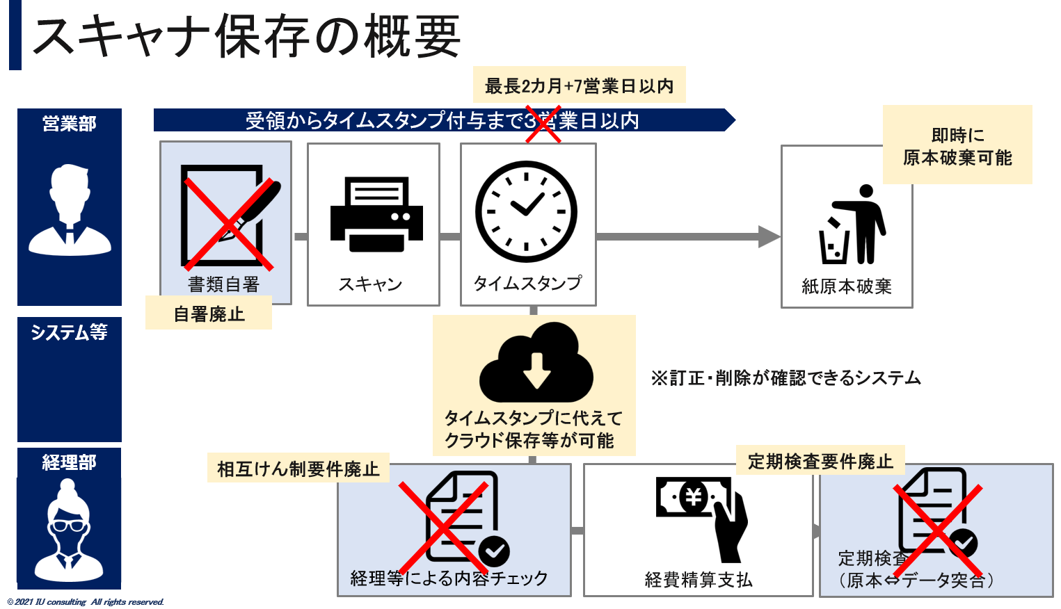 自署廃止、相互けん制要件の廃止、タイムスタンプ付与期間の延長又は訂正削除が確認できるシステムの導入により、即時に原本を破棄することができるようになります。