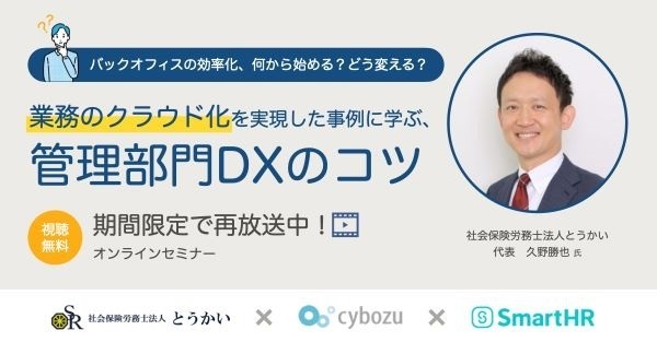 クラウドソフトを有効活用し、コミュニケーションから案件管理、実務に至るまでをオンラインで完結できる仕組みを整え、業務効率化に成功した社労士法人とうかい様をお呼びして、管理部門のDX成功のコツをお話しします。