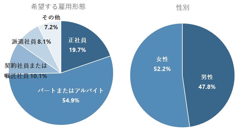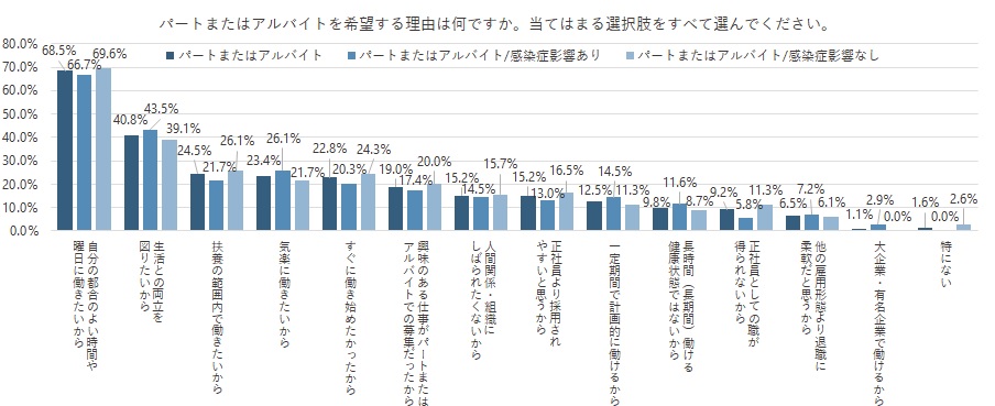 また、パートもしくはアルバイトを希望する人々にも希望理由を質問(複数回答可)。最も多かったのは「自分の都合の良い時間や曜日に働きたいから」(68.5%)、次いで「生活との両立を図りたいから」(40.8%)、「扶養の範囲内で働きたいから」(24.5%)という結果になった。