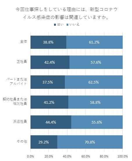 本アンケートではまず求人に応募した人に、今回の求職理由に「新型コロナウイルス感染症の影響」は関連しているかを尋ねた。結果は全体の38.8%が「はい」と回答。コロナ禍の影響を受けて仕事を探している人は4割未満だった。
