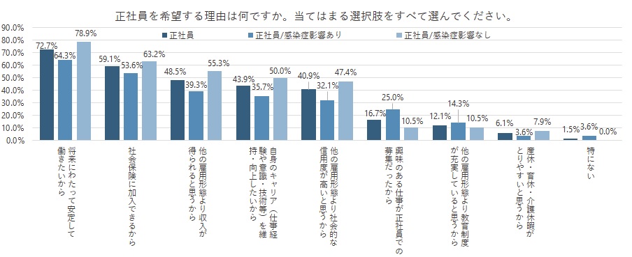 ちなみに、新型コロナウイルス感染症の影響を受けて求職活動をしている人は「感染症影響なし」の人に比べて、「興味のある仕事が正社員での募集だった」を選んだ割合が高かった。一方「感染症影響なし」の人たちは正社員職に対して、収入面や社会的な信用度の高さ、安定性をあげる傾向が強いことも判明した。